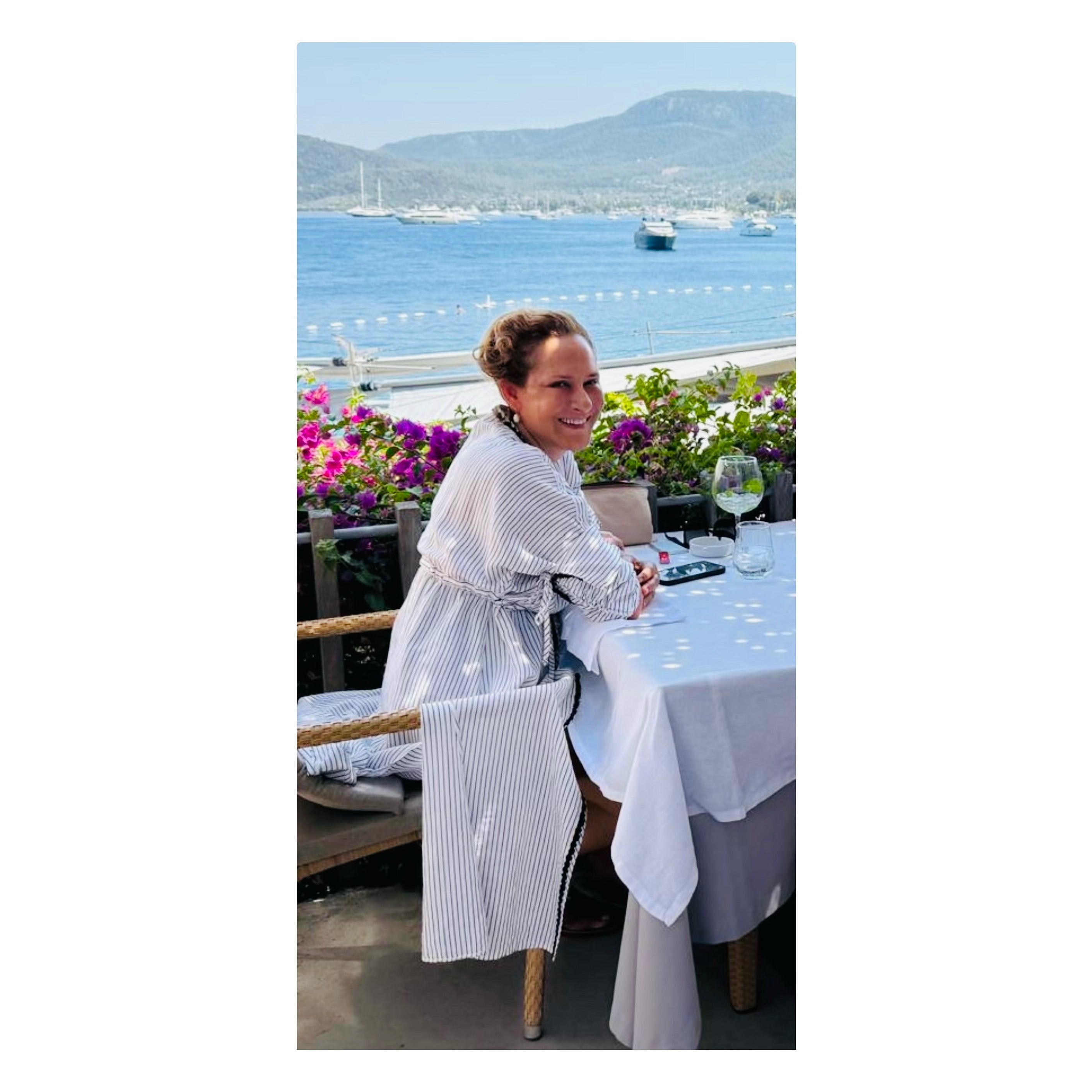 Pamuk ve viskon siyah çizgili kumaşlı, uzun plaj elbisesi. Uzun burkulmuş kollu. V yakalı, önden minik düğmeli, belde iç kemerle kapanıyor. Boydan boya açılan öndeki kısmı ve kol ağızını siyah bir sutaşıyla süslendik. Derin yan yırtmaçlı. Tek beden.